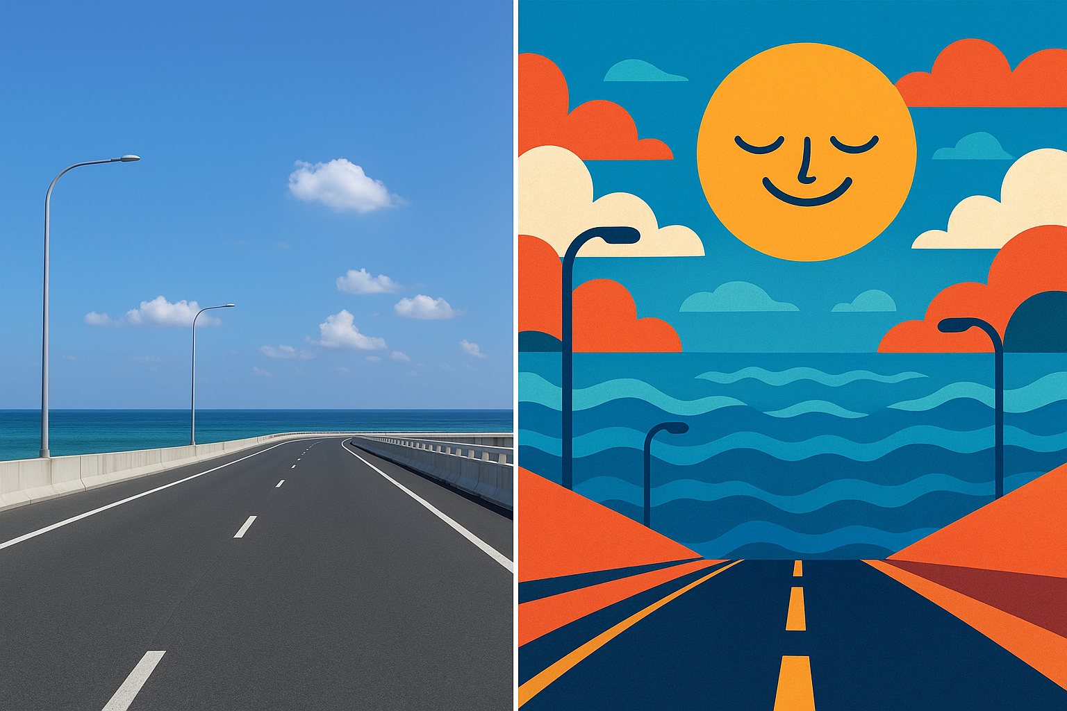 꿈은 늘 예고 없이 찾아오죠. 이번에도 그랬어요. 어디인지 모를 고속도로를 운전 중이었고, 주변은 무채색으로 덮여 있었죠. 풍경도, 차량도, 심지어 하늘마저도 무감각하게 흐려져 있었어요. 그런데 어느 순간 도로 끝에서 뭔가 푸른 것이 보였어요. 점점 다가갈수록 그것이 바다라는 걸 알게 됐고, 이상하게도 파도가 치는 게 아니라... 바다가 ‘웃고’ 있었어요. 말도 안 되는 설정인데, 꿈속의 나는 그걸 믿고 있었고, 어딘가 모르게 위로받는 기분이었죠.